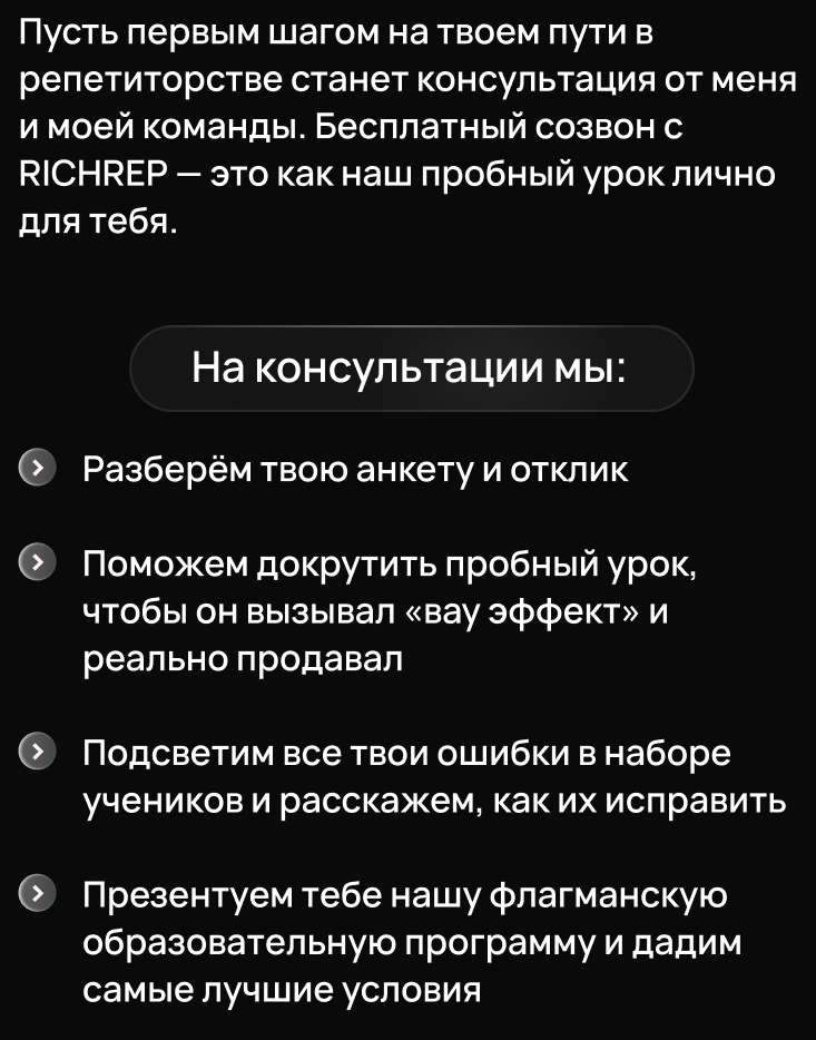 RICHREP — это онлайн-школа для репетиторов, которая родилась из моей собственной боли. Годами я страдал в попытках подняться в репетиторстве в одиночку, поэтому прекрасно понимаю все трудности и страхи, с которыми ты сейчас сталкиваешься.